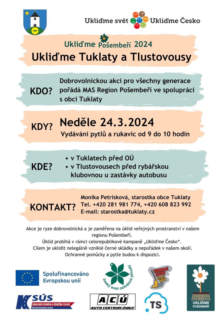 Dobrovolnickou akci pro všechny generace pořádá MAS Region Pošembeří ve spolupráci s obcí Tuklaty. Více v přiloženém plakátu.