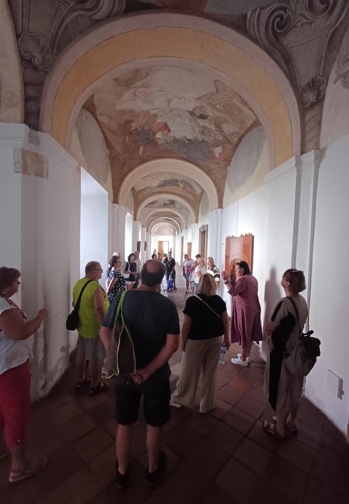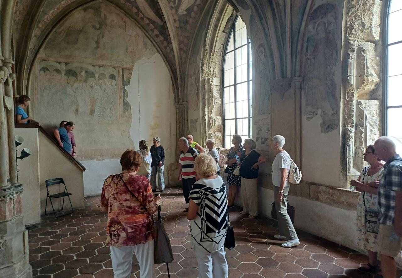 První zastávkou výletu byl klášter Sázava, kde proběhla komentovaná prohlídka okruhu Svatoprokopská Sázava. Během prohlídky se návštěvníci seznámili s příběhem svatého Prokopa a měli taképříležitost v ambitu vidět vzácnou barokní freskovou výzdobuzobrazující útržkyze života světce. V Kapitulní síni ze 14. století,jedné z nejkrásnějších prostor kláštera,se podivovali nad pozoruhodnými nástěnnými malbami inspirovanými životem Panny Marie. „Klášter Sázava je skvostem naší historie, a senioři ocenili jak bohatý výklad průvodkyně, tak atmosféru tohoto významného místa,“ uvedla Zdenka Bočková.